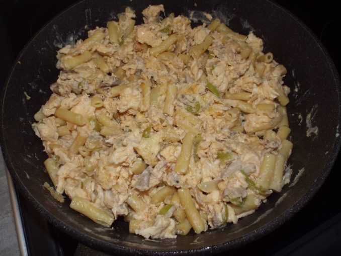 Когда надоедают молочные каши, жареные яйца и омлет, я готовлю на завтрак "усложненный" вариант яичницы-болтуньи. Кусочек курицы откладываю, когда варю суп. Макароны использую те, что остались с ужина. При таких вводных, завтрак готовится очень быстро. Все обжарить, залить яйцами и перемешать.